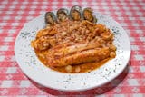 Thin sheets of pasta rolled and stuffed with ricotta cheese, topped with marinara sauce and mozzarella cheese.